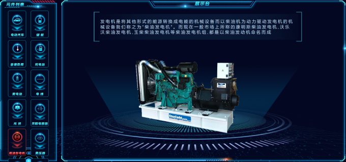 学生通过鼠标点击各设备的虚拟场景,对配电网的关键设备进行认知,如图2.8.4为配电网中的柴油发电机相关知识介绍。学生通过学习各元件电气参数与工作特性,掌握配电网的架构与连接方式。