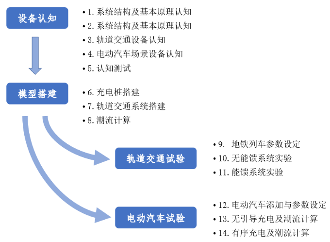 城市电气化交通系统高效用能虚拟仿真实验按照设备认知、仿真搭建、数据交互验证和科教前沿4个环节,进行模块化、难度适宜的实验教学: